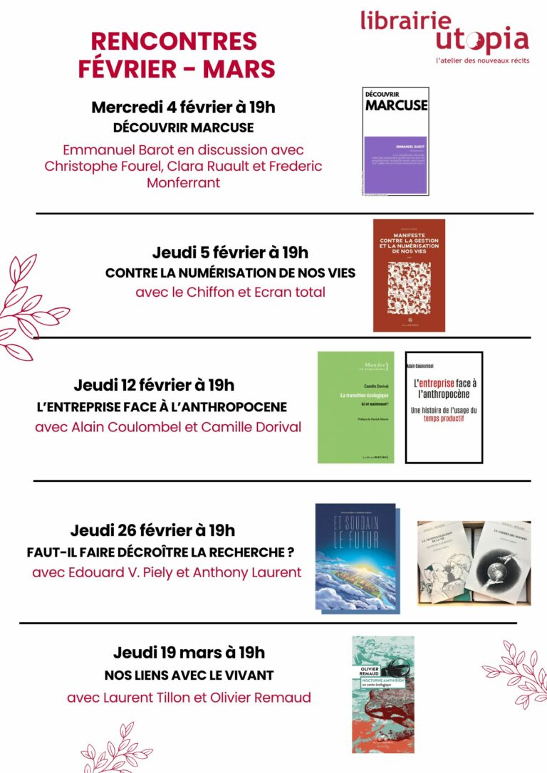Les rencontres ont lieu à la Librairie Utopia à Paris et sont également visibles par Zoom: voir le détail des prochaines rencontres ici …