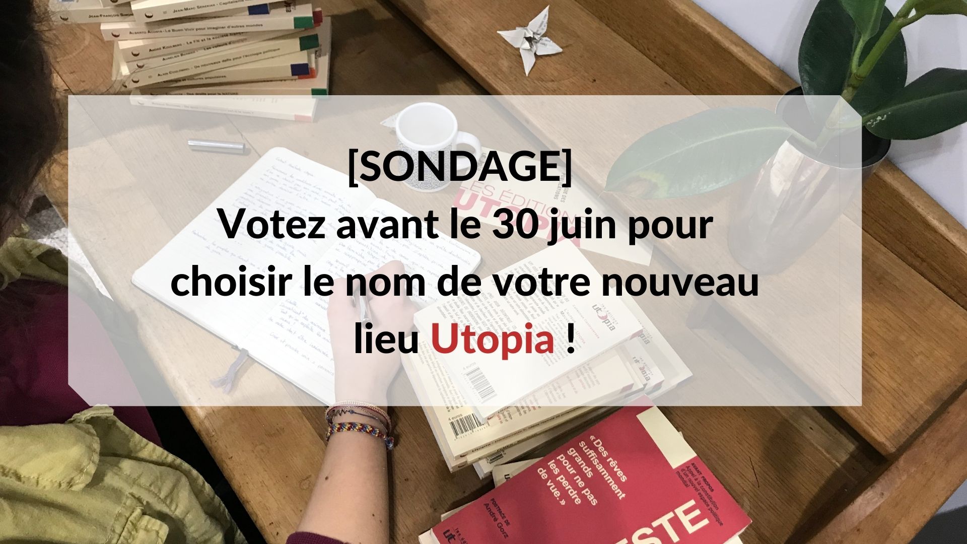 Notre librairie écolo Utopia ouvrira ses portes prochainement, seulement, il reste encore à lui trouver un nom. Nous avons retenu 9 noms possibles pour notre enseigne, mais notre choix ne