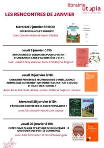Actualités une rencontre /dédicace jeudi 4 décembre à l’Académie du climat à 19h45 UtopiaCR 2 décembre 2025 Article précédent Rencontres décembre-janvier à la librairie et .... n'oubliez pas de venir à la librairie acheter ...ou commander vos cadeaux de Noël ! Article suivant les rencontres de janvier à la librairie Utopia